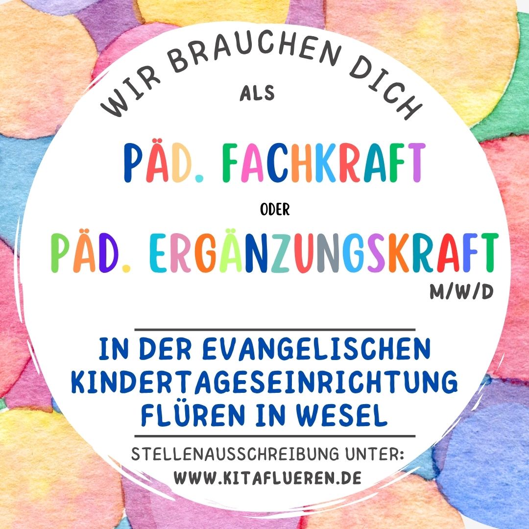 Die evangelische Kita Flüren ist eine Einrichtung mit 2 Gruppen und betreut insgesamt 45 Kinder im Alter von 2 Jahren bis zum Schuleintritt. Gesucht wird eine päd. Fachkraft oder Ergänzungskraft (m/w/d) die unser Team in Teilzeit (20 Std.) zum nächstmöglichen Zeitpunkt ergänzt. Die Stelle ist zunächst bis zum 31.07.2027 befristet.